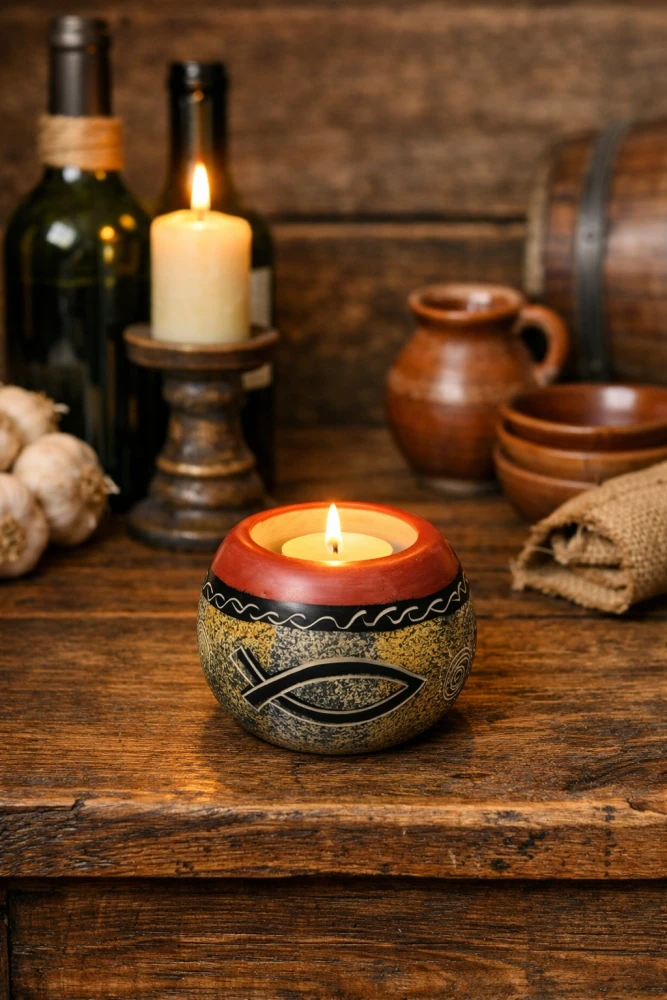 Una ciotola portacandele in pietra ollare dal design rotondo e compatto, caratterizzata da una presenza solida e un peso importante che trasmette immediata sensazione di qualità. Il diametro di circa 7 cm la rende ideale per tealight o piccole candele votive, creando un punto luce raccolto e suggestivo.