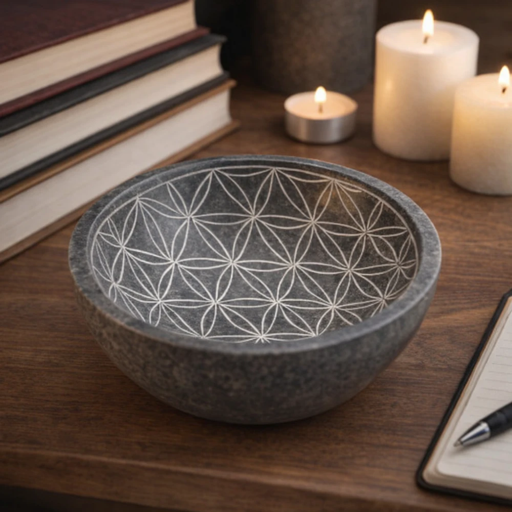 Ciotola in pietra ollare con simbolo Fiore della Vita, ideale per creare atmosfera su scrivanie e angoli meditativi. Piccoli Oggetti, Grande Atmosfera: Arreda con Bellezza e Significato.