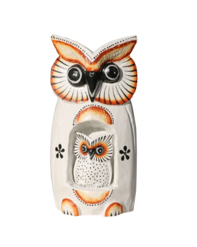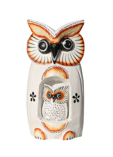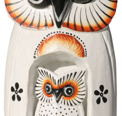 Civette creazioni in legno esotico, Intagliate e dipinte da abili artigiani indonesiani con tecniche artigianali. Simpatiche e originali civette portafortuna con civettina in pancia estraibile. Con occhioni grandi, rallegrano ogni angolo di casa, donando un delizioso tocco etnico all’ambiente. Disponibili color nero con decori floreali avorio o bianchi con particolari neri e marroni.