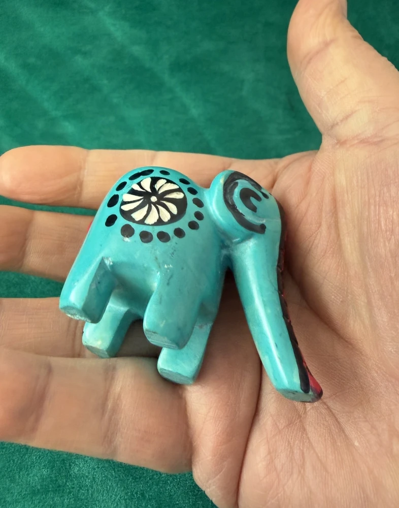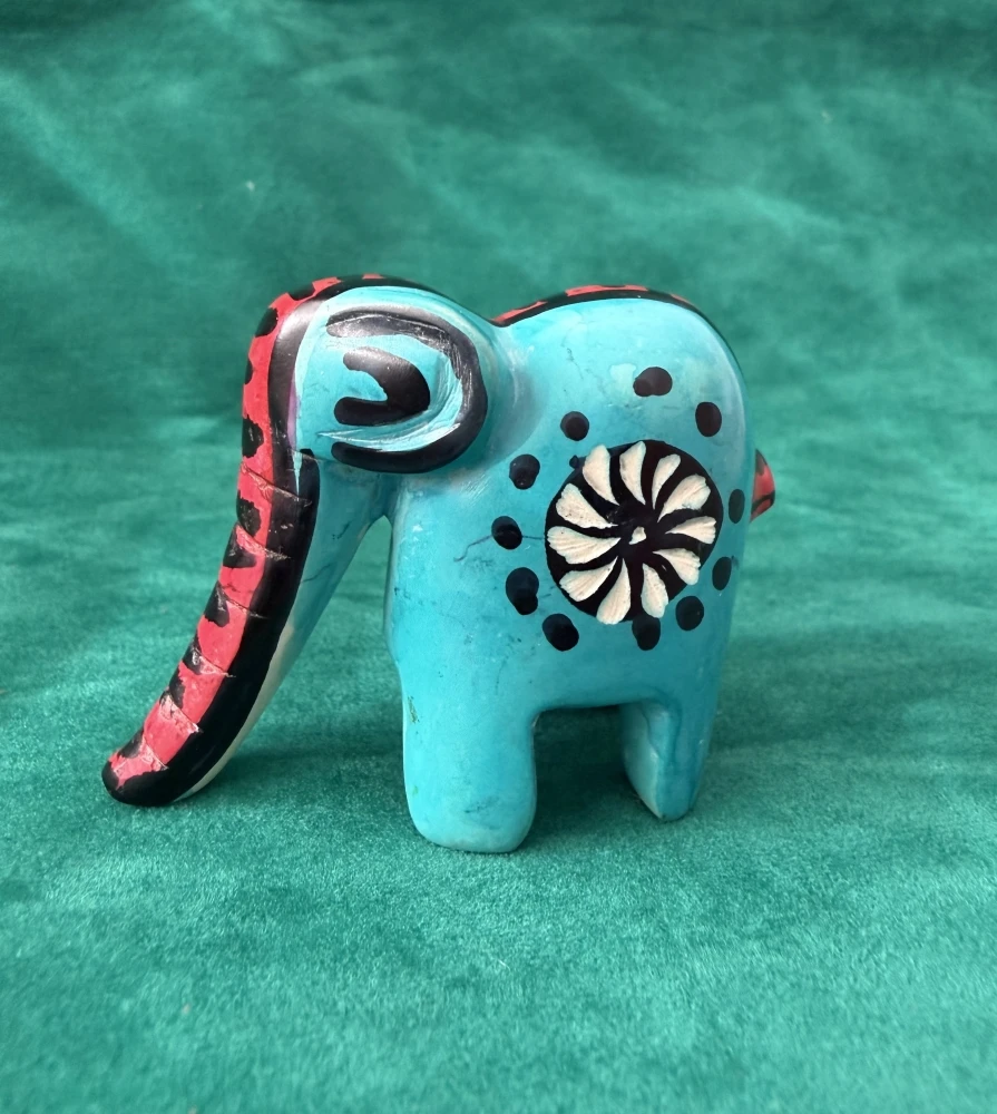 Elefante azzurro scolpito a mano in pietra ollare. Elefante in pietra ollare verde, decorato con motivi etnici dipinti con cura. Un piccolo pezzo d’arte che porta con sé il fascino della lavorazione artigianale e un tocco di colore vibrante.