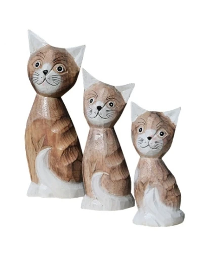 Gatti in legno dipinti a mano, scolpiti artigianalmente in Indonesia. Soprammobili eleganti, simbolo di protezione e armonia per la casa. Disponibili singoli o in tris, perfetti anche come idea regalo.