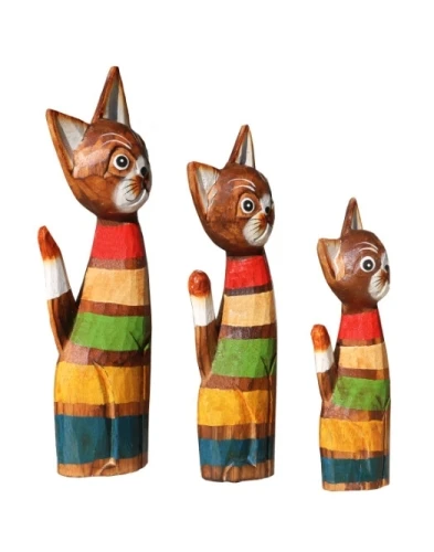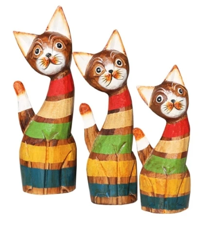 Graziosi set di gattini realizzati in legno esotico, intagliati e dipinti a mano da artigiani indonesiani. Dipinti con cura vengono realizzati con colori vivaci e antichizzati successivamente. Abbelliti con collarino di corda di midollino naturale.Dolci micini regalano un piacevole tocco etnico all’ambiente. Disponibili con colore di base noce medio e strisce colorate nei classici colori rasta, verde, rosso e giallo.