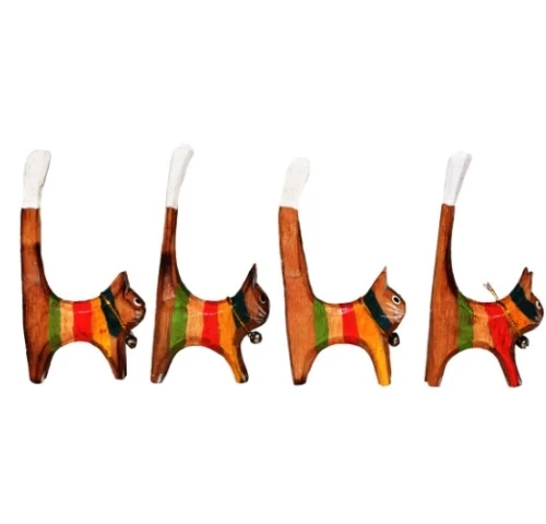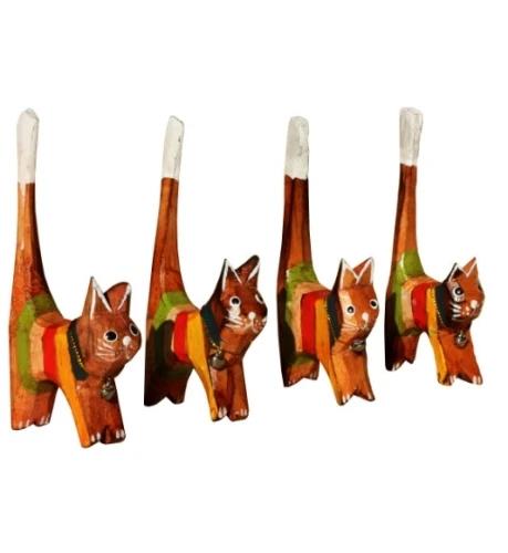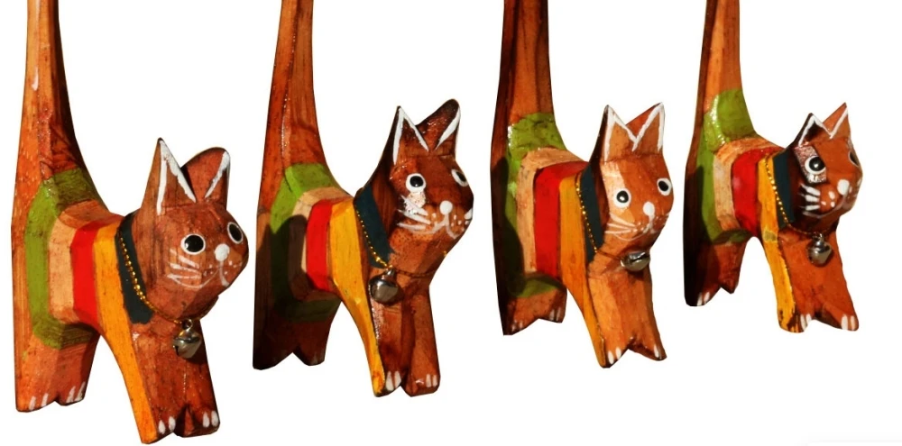 GATTINI MINI RASTA CON CAMPANELLINO ( set 4 pz. ). Creazioni in legno, idee regalo. Dolci e simpatici micetti realizzati da artigiani indonesiani in legno esotico intagliati e dipinti a mano ed abbelliti da un collarino dorato realizzato da filo di broccato dorato e un campanellino centrale argentato. Belli come soprammobili, si possono anche usare come portanello, infilando gli anelli nella coda. Set di 4 pz. Disponibili color noce medio con finale del codino bianco e striature rasta.