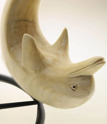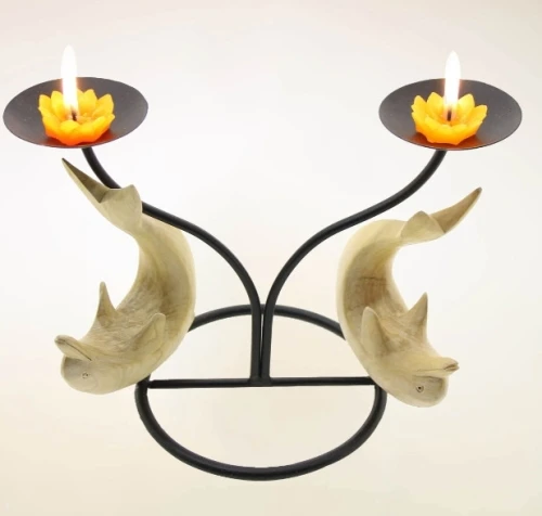 Graziosi portacandele, realizzati artigianalmente in ferro battuto e legno naturale esotico molto chiaro di qualita’ pregiata da artigiani indonesiani, con due piattini dotati di spuntoni per apporvi anche le candele alte, che si possono piegare se si usano le tea-light. Disponibili con struttura nera e delfini color frassino. Si usano nel Feng Shui per armonizzare la casa.