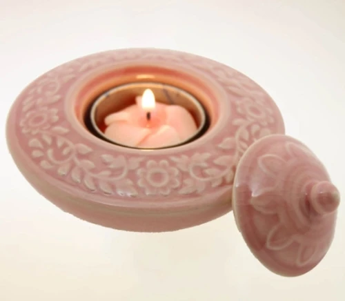 Graziosi portacandele con coperchio realizzati in ceramica smaltata da artigiani thailandesi. Decorati con motivi orientali e floreali a rilievo, si possono usare anche come piccola scatolina. Donano un delicato tocco romantico all’ambiente. Disponibili nei colori pastello viola, rosa e bianco. Ideali per candeline tea-light.