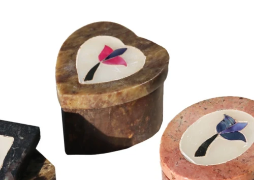 Carine e romantiche scatoline realizzate in marmo indiano o pietra saponaria da artigiani indiani con antiche tecniche artigianali tipiche del Nord India e del distretto di Agra. Eleganti scatoline finemente intarsiate con alabastro e pietre semipreziosee ad effetto madreperlato. Utili come mini portagioie. Misure: cuore cm 4,8 x 5,3 x h cm 3,5.