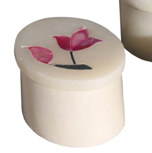 Piccoli contenitori realizzati in marmo alabastro e pietre semipreziose in India con antiche tecniche artigianali tipiche del nord India e del distretto di Agra. Il marmo alabastro si presenta candido e lucido, le pietre usate per l’ intarsio lucide e madreperlate. Utili come portagioie, monete o minuterie. Disponibili color bianco naturale con pietre nei toni dell’ azzurro e relative sfumature e del fucsia e relative sfumature . Le forme sono: rettangolare, ovale, rotonda e a cuore.