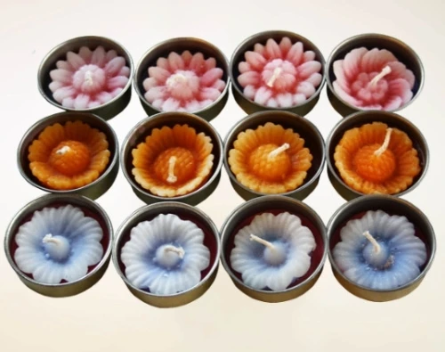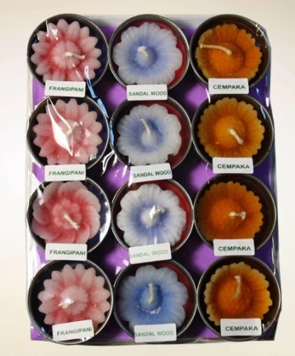 Colorate candeline a forma di fiorellino, profumate , adagiate su ciotolino di metallo, realizzate con tecniche artigianali da produttori indonesiani. Disponibili in colori e profumazioni assortite, come da foto. Belle da tenere a scopo decorativo nei portacandele quando non si utilizza acceso con tea-light. Confezione da 12 pz. Il ciotolino, opportunamente vuotato, e’ riutilizzabile anche per tealight.