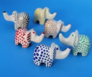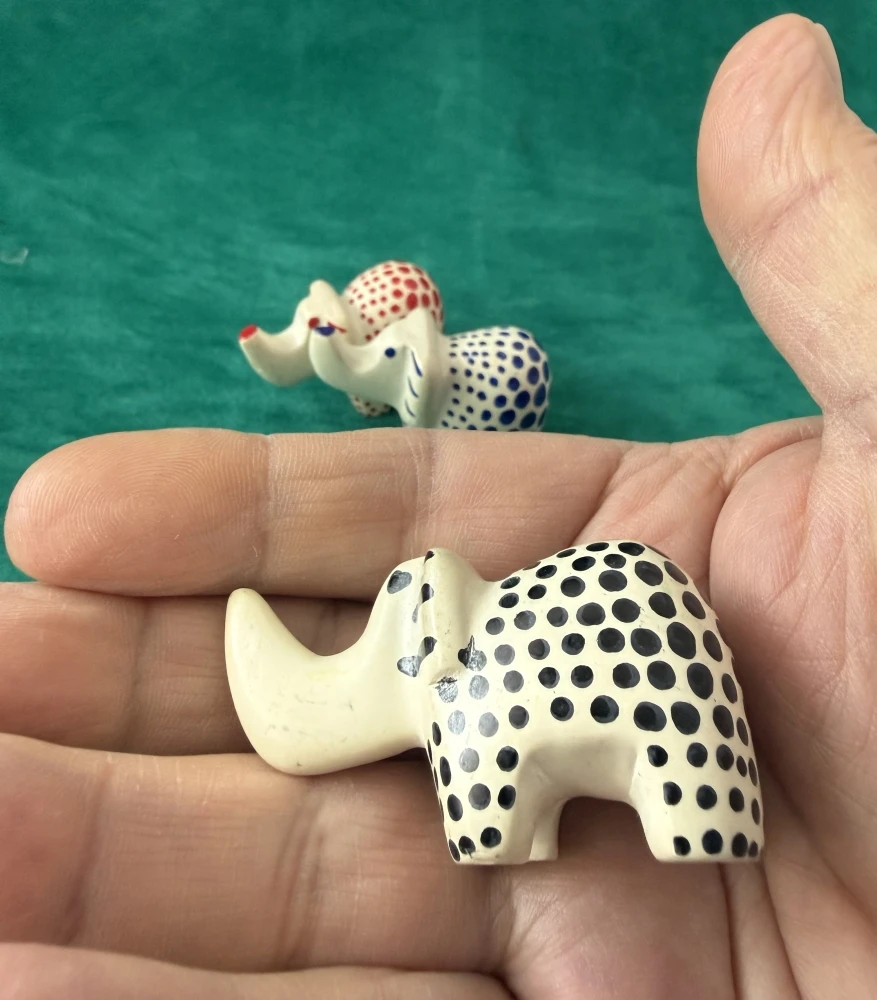 Set di 5 elefantini in pietra ollare dipinti a pallini colorati. Elefantini in soapstone del Kenya, perfetti come oggetti da collezione e decorazioni colorate per la casa. Ogni elefantino a pois è unico e realizzato da artigiani locali, ideale per chi cerca decorazioni etniche, artigianato africano autentico e piccoli oggetti ornamentali dal forte valore simbolico.