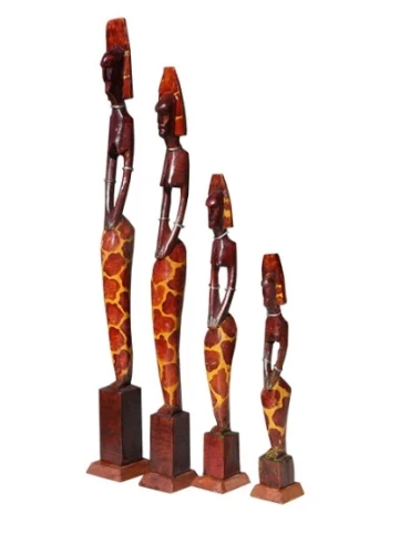 Originali set di 4 statuine realizzate in legno esotico raffiguranti una famiglia africana dai vestiti variopinti, intagliato e dipinto a mano da abili artigiani indonesiani. Stilizzate statue africane ideali come soprammobili donano uno grazioso tocco etnico all’ ambiente. Disponibili color legno scuro con abiti variopinti in molteplici colori decorati con puntini o nella versione maculata stile giraffa.