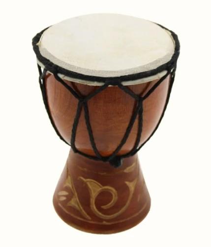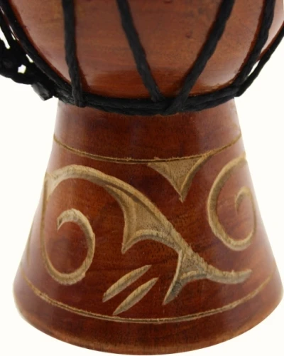 Miniature di percussioni africane denominate jambee, realizzate in legno e pelle, intagliate e dipinte a mano. La pelle utilizzata proviene da mucche morte per ciclo naturale. Belle come soprammobili danno un piccolo tocco etnico all’ ambiente. Disponibili in marrone medio con intagli chiari. Misure: altezza cm 16 x diametro cm 11. Il DJEMBE o jambee è un tamburo di piccole o grandi dimensioni, realizzato con legni duri, originario dell’Africa Occidentale, in particolare della Guinea Conakry, Mali, Burkina Faso, Senegal e Costa d’Avorio. Il corpo di questo strumento è cavo, con una tipica forma a calice. La sua superficie interna deve essere liscia e levigata per contribuire alla ricchezza del timbro dello strumento. La membrana, tradizionalmente è in pelle di capra e più raramente in pelle di mucca e il sistema di tiraggio della pelle stessa è formato da corde e in certi casi da cerchi metallici. Il jambee si distingue fra i membranofoni per una gamma di toni particolarmente ampia, che ne consente l’uso come strumento solista, oltre che ritmico. Sostanzialmente i colpi sono tre: lo slap, il tone ed il bass. Si suona con le mani e per riprodurre i toni fondamentali occorre una certa pratica. Importante è sia la posizione in cui si colpisce la membrana, quanto la consistenza del colpo. Il tone (colpo medio ) si potrebbe descrivere come concentrato e si ottiene colpendo lo strumento tenendo il polso rigido. Lo slap è un colpo invece diffuso e si ottiene dando maggiore elsticità al polso e tenendo le dita leggermente aperte. Il passaggio tra i due corrisponde al passaggio da toni più bassi a toni più alti. Il terzo colpo fondamentale è il bass, il colpo più basso, che si produce colpendo il tamburo al centro della pelle. Tradizionalemnte il djembe viene usato in ensemble con altre percussioni, come i dunun, tamburi bassi, e nella maggior parte dei casi ricopre il ruolo di solista. E’ uno strumento di comunicazione sociale e ricopre un ruolo molto importante nell’accompagnare danze cerimoniali e rituali e anche feste.