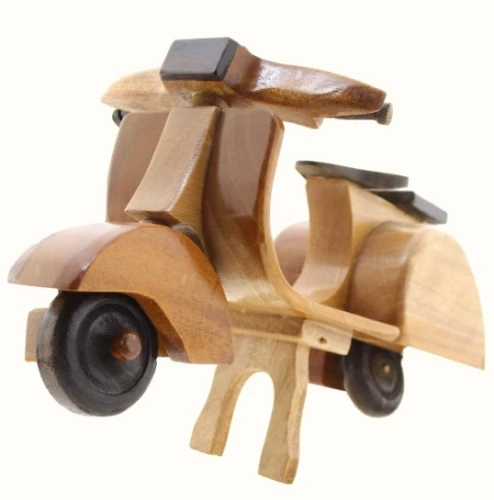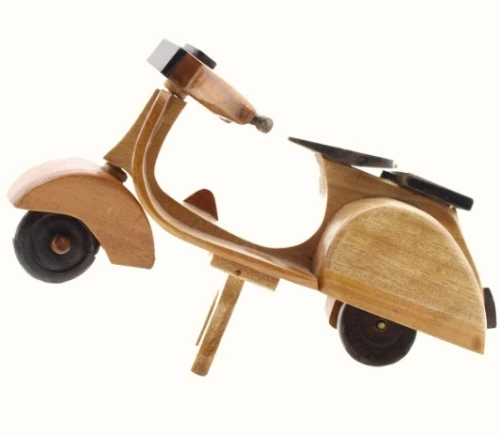 Originali modellini di vespa in legno realizzati a mano assemblando legno chiaro e medio con particolari noce scuro da abili artigiani thailandesi. Graziosissime vespe saranno graditissimi regali per molteplici estimatori di questo mitico ciclomotore. Fantastiche come soprammobili, abbelliscono e ornano ogni ambiente. Disponibili in legno chiaro quasi frassino.